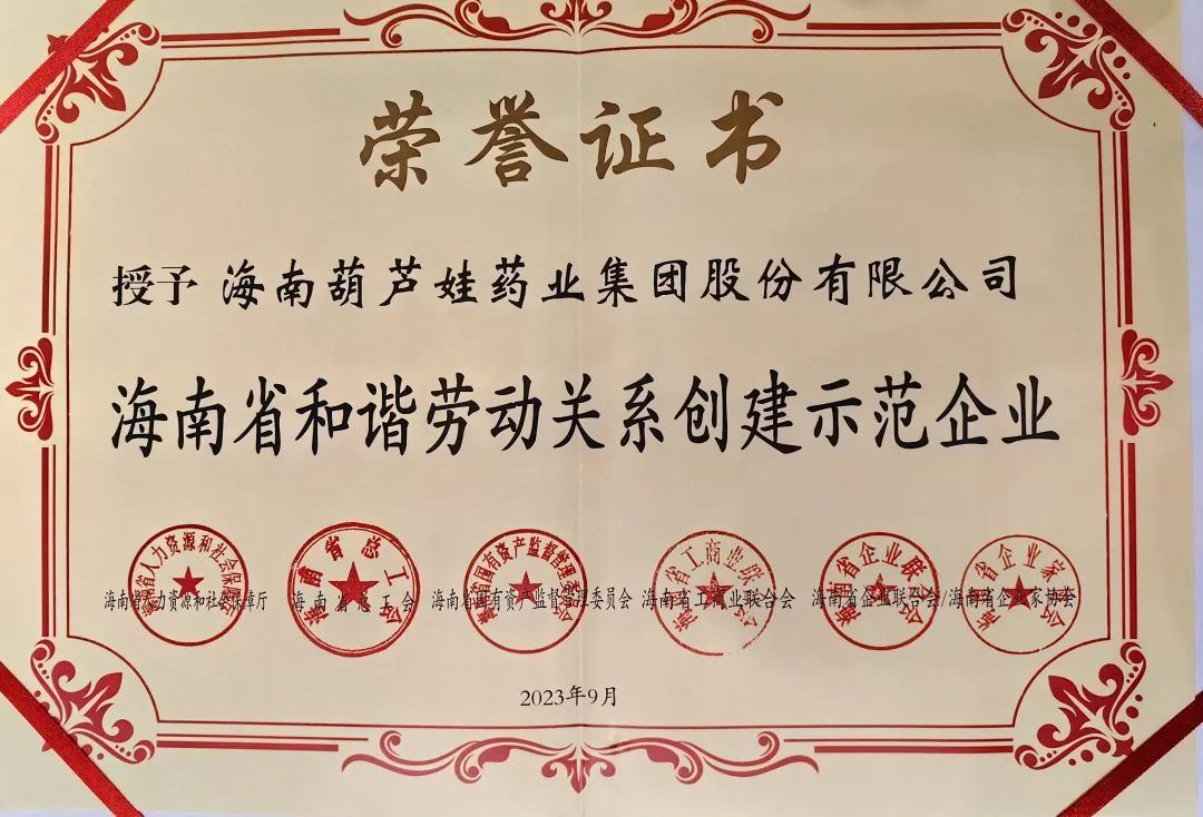 G22恒峰药业集团获评“海南省和谐劳动关系创建示范企业”