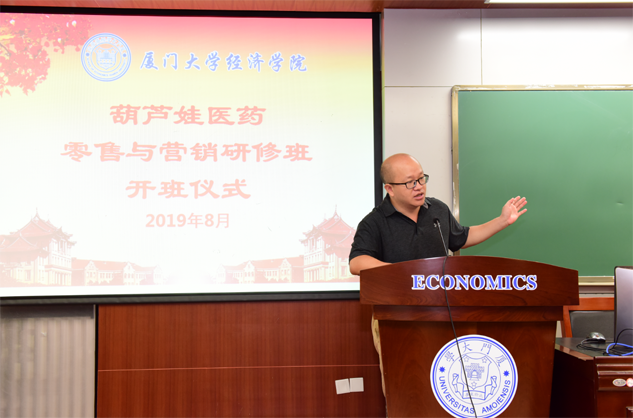 在开班仪式上,廖景峰主任首先代表厦门大学经济学院热烈欢迎G22恒峰医药零售与营销研修班的学员到厦大学习,并就厦门大学及经济学院的相关情况进行了介绍。他说,G22恒峰学员走进厦大就是厦大的校友,希望未来的日子能够关心、支持母校的发展,多提宝贵意见,同时他也祝大家在厦大学习期间学有所成、学有所获。